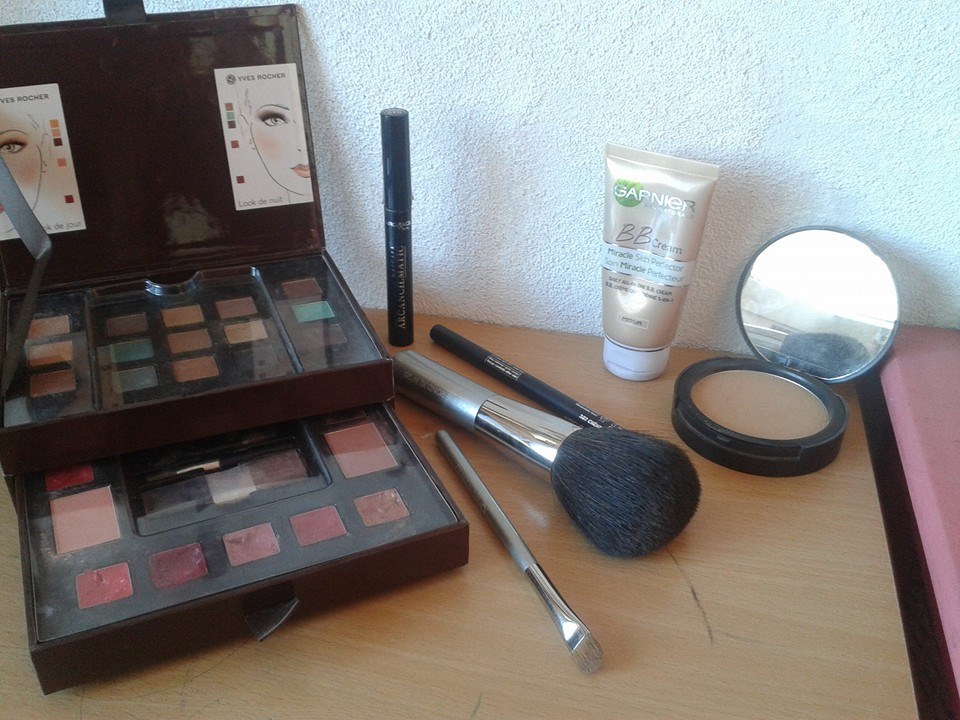 29/03/2014 13:53Coucou ! Aujourd'hui nouvelle Photo "My Makeup" avec ma pallette Yves Rocher mon fond de teind de Garnier mascara Arcancil Marron et un Eye Liner marron de chez Arcancil et ma poudre de Bautty Succes Mat Confort et mon pinceau gros poil et un pinceau paupiere plat ....
